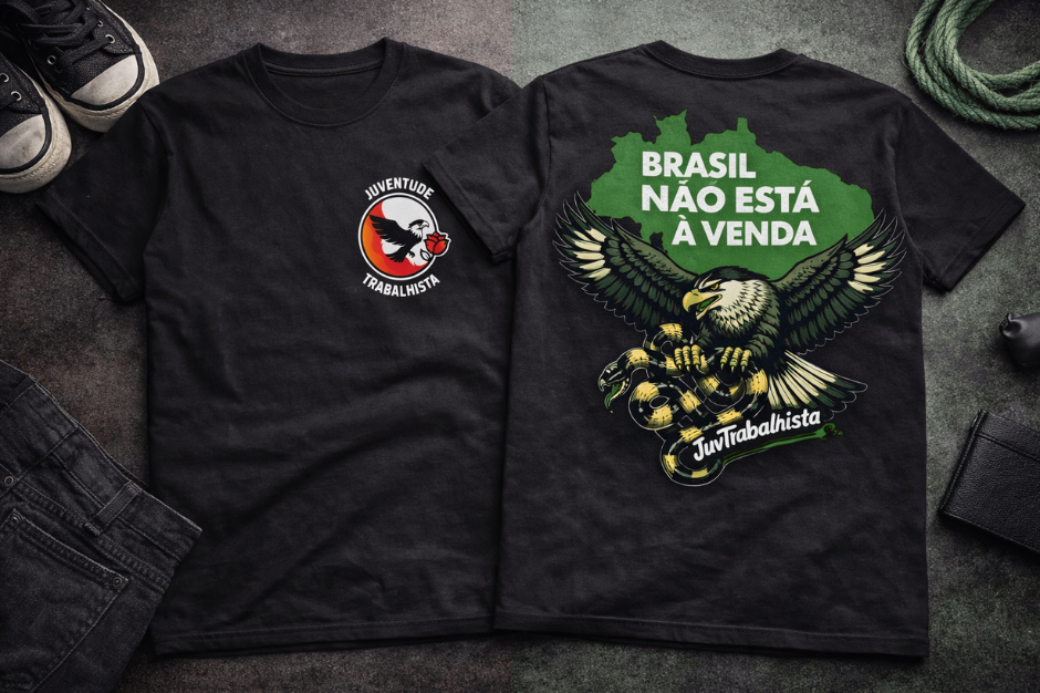 Camiseta preta com logo da Juventude Trabalhista na frente e estampa "Brasil nao esta a venda" nas costas. Algodao premium.